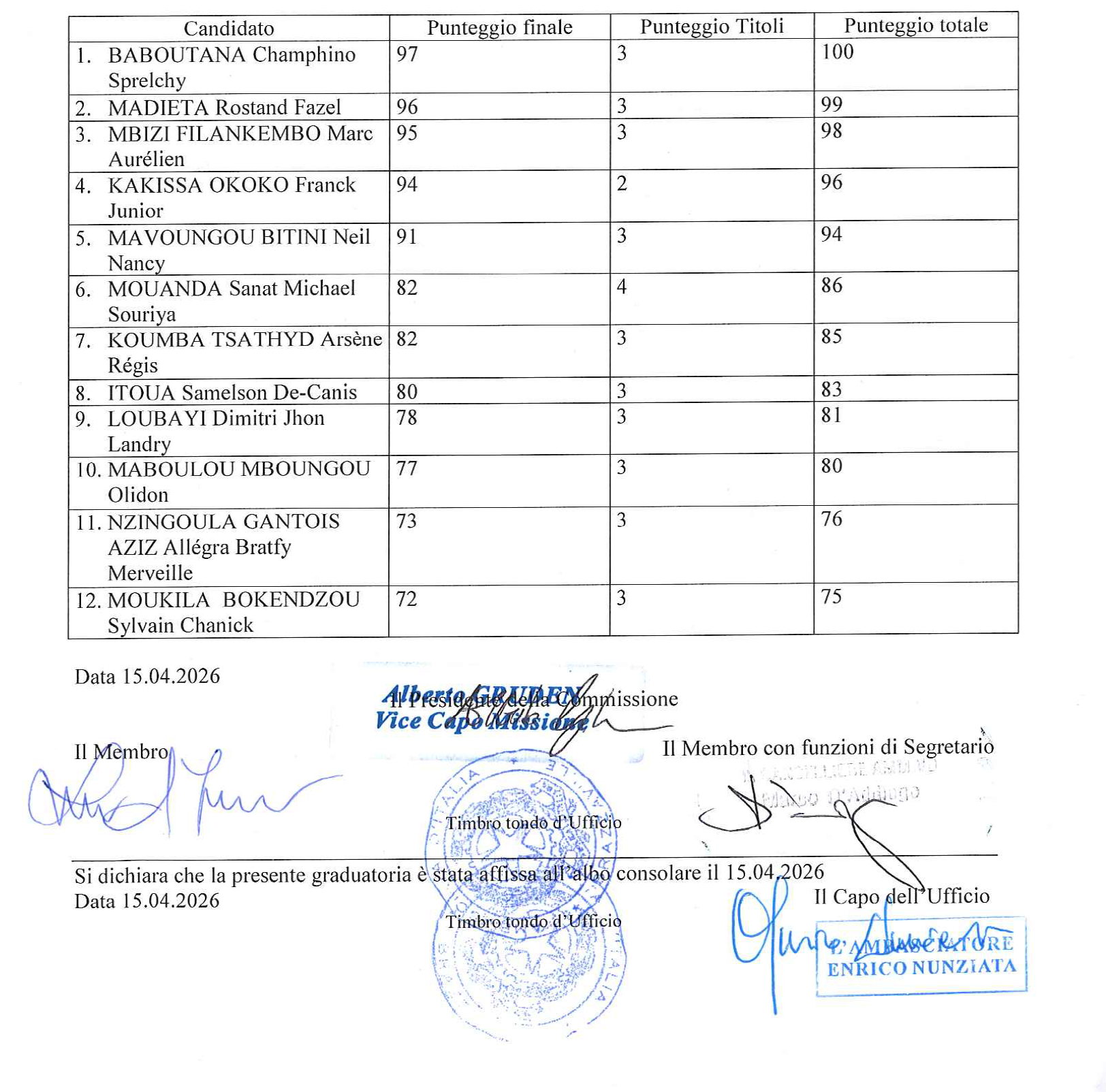PROVE D’ESAME PER L’ASSUNZIONE N. 1 IMPIEGATO A CONTRATTO DA ADIBIRE AI SERVIZI DI AUTISTA, COMMESSO E CENTRALINISTA PRESSO L’AMBASCIATA D’ITALIA IN BRAZZAVILLE GRADUATORIA FINALE DEGLI IDONEI